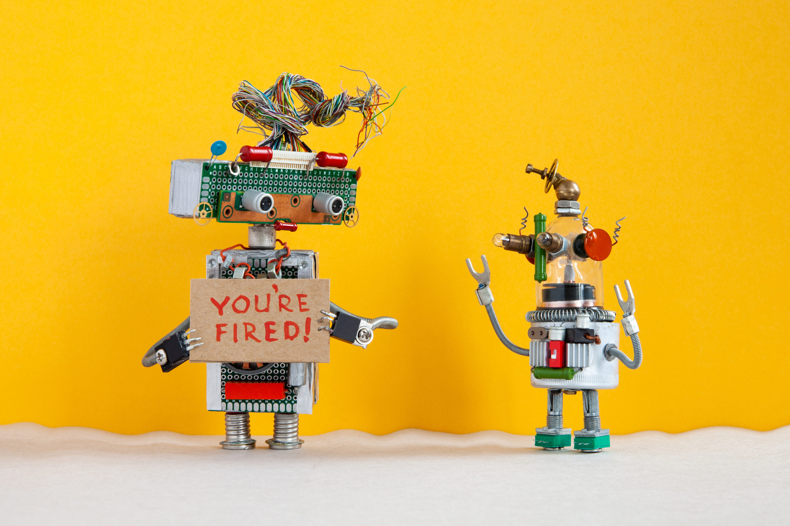 Robot chief dismisses younger robotic employer. Robotic character with a cardboard sign and handwritten text You are fired and small android dissatisfied with loosing vacancy. yellow background.