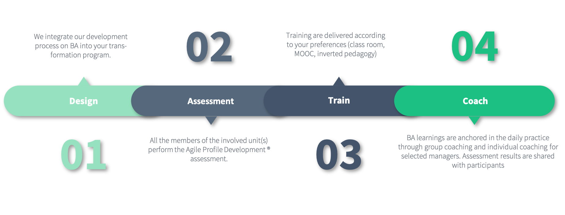 Help the individuals, teams and the organisation to better act together leveraging on behavioural agility postures and levers (Cooperation: synchronisation and systemic empathy – Anticipation: proaction and situational intelligence – Innovation: pedagogy and constructive rebellion).