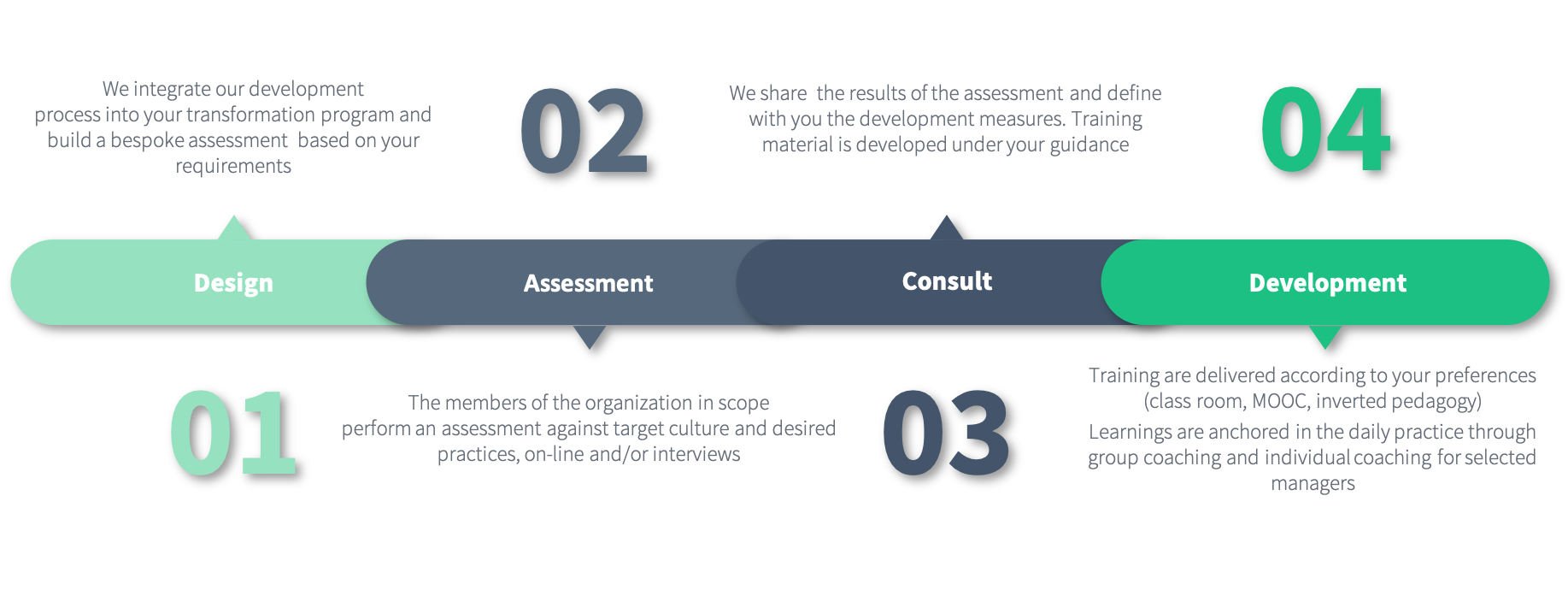 You plan to transform your organization culture and know that 70% of those transformation fails according to John Kotter. You know where you are and where you want to go; we will help in measuring where each unit is between the old and new culture leveraging on our Polar Culture Index to feed each of them with appropriate nutrient and therefore speed up your transformation process bringing forward the benefits of the program.