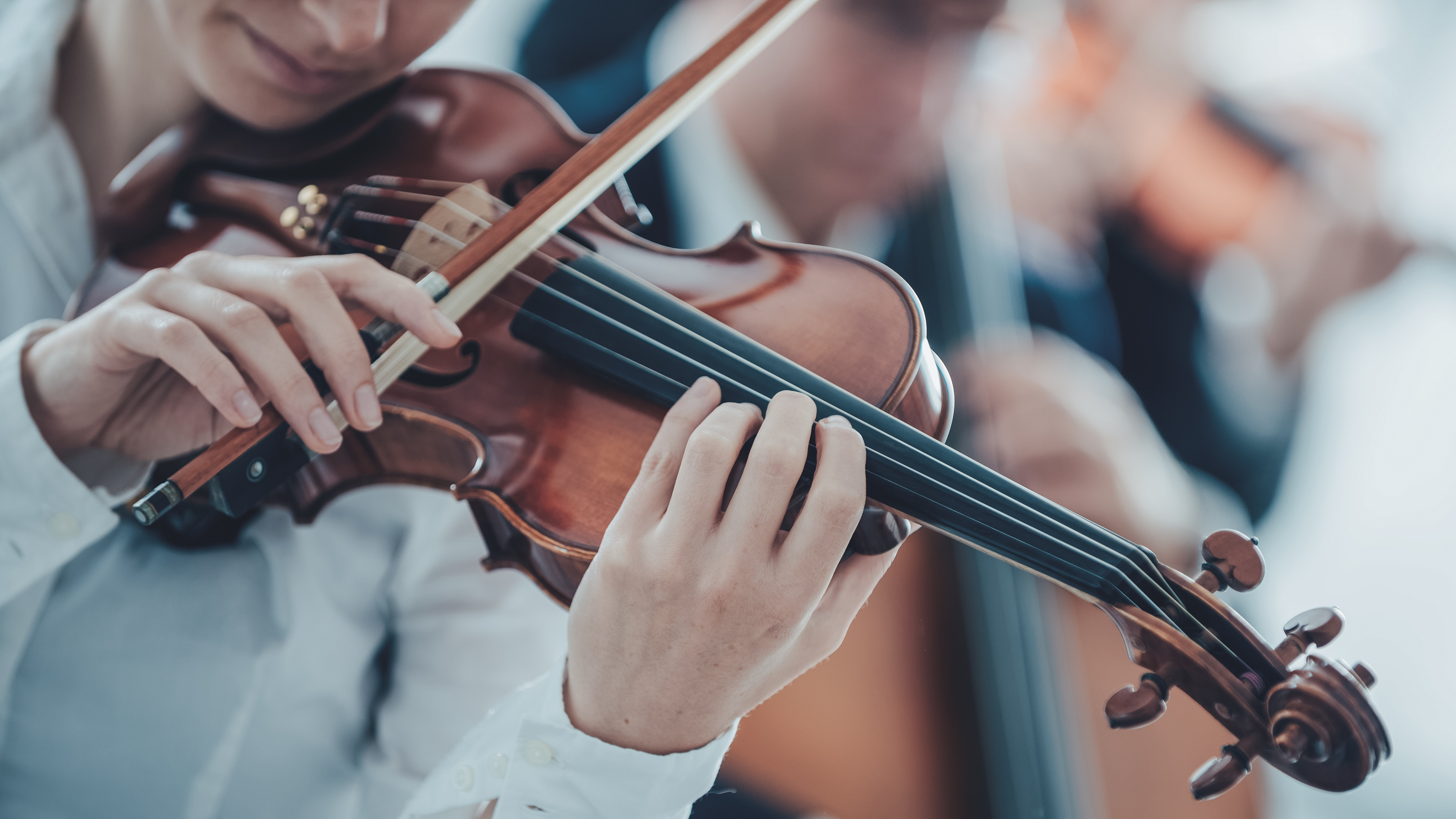 Talented violinist playing with orchestra